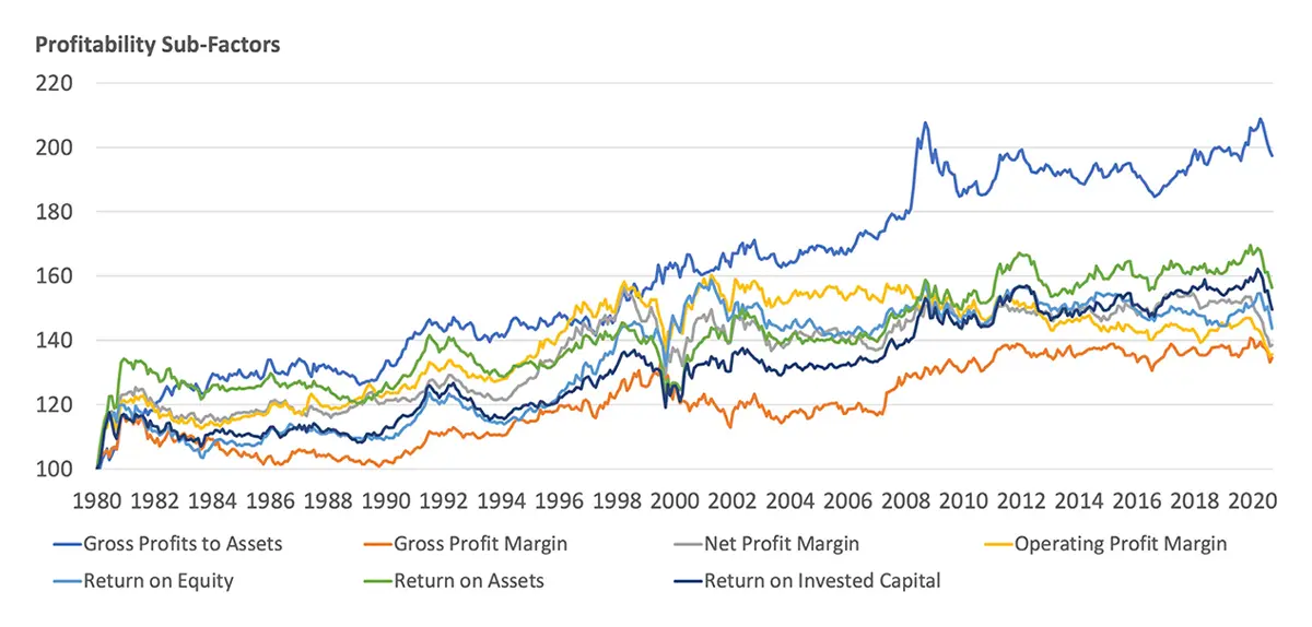 Figure 1 shows a comparison of each of these sub-factors’ returns from over the past 41 years, since 1980. While all of these profitability-based subfactors outperform the broader market over this period, all but one of them remain in a band that’s valued at 40% to 60% above the starting point.