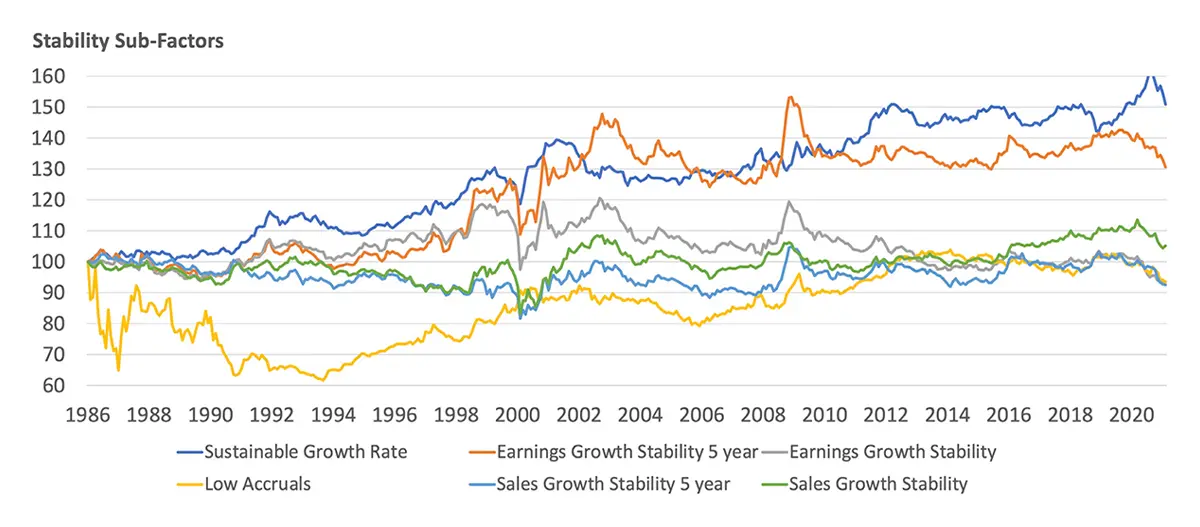 Stability measures purport to provide a degree of quality based on the idea that consistency in financial reporting is a characteristic of well-managed companies and that such stability leads to more pronounced performance. We examined the following stability-based Quality sub-factors:
