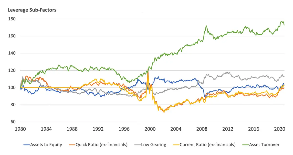 • Leverage-based sub-factors have no correlation, or slightly negative correlation, with each other (-0.07), essentially acting each on their own.