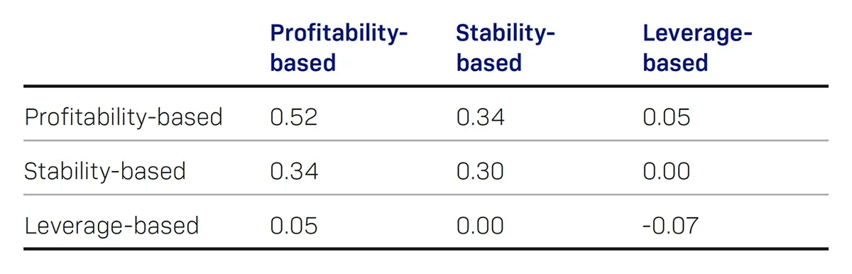 • Within each group, the profitability-based sub-factors are most strongly correlated with each other at 0.5, and the stability-based sub-factors are also positively correlated with each other but to a lesser degree: 0.3.
