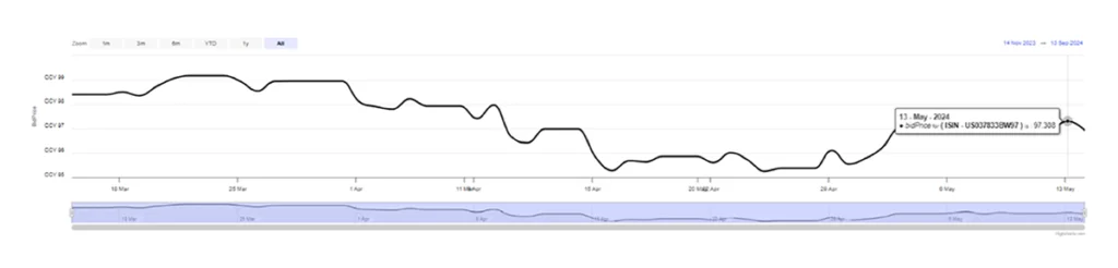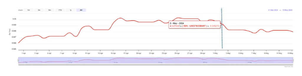 On Monday, May 2nd, after better-than-expected quarterly results, Apple’s bond yield decreased but is still at higher levels than at the beginning of last month. Apple also announced a $110 billion share buyback, and shares soared over 6% by Friday, May 10th. The company’s value reached 2.86 trillion dollars.