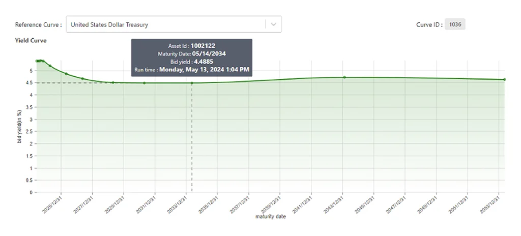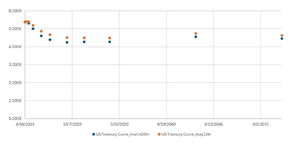| Duration | Maturity date | US Treasury Curve: Mar 20th | US Treasury Curve: Mar 22nd | US Treasury Curve: Apr 23rd | US Treasury Curve: May 13th |