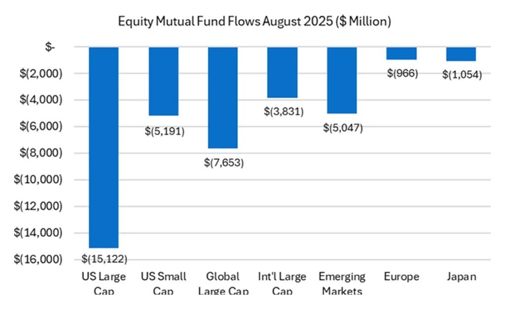 Positive equity returns across major economies were driven by growing optimism around monetary policy, strong corporate earnings, and easing trade tensions compared to the previous month. Additionally, the decline of the U.S. dollar enhanced the relative attractiveness of Emerging Markets and the Eurozone. Compared to the previous month, equity mutual funds saw a decline in inflows across all regions in August, with overall flows turning negative.
