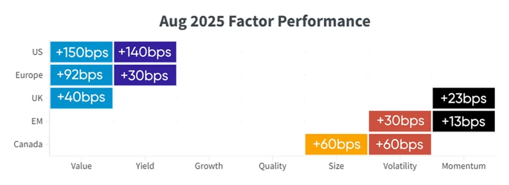 The Volatility factor underperformed in August 2025 after strong gains in July, as equity markets stabilized, risk appetite improved, and robust corporate earnings helped ease investor concerns. This is in contrast to the previous month when market uncertainty – driven by mixed economic data and labour market worries – boosted Volatility. August saw a decline in investor anxiety, supported by solid earnings reports and positive signals from the Fed, which led to Value and Yield factors outperformance in U.S. equities, as investors rotated toward undervalued companies with strong and consistent dividend payouts, seeking safety and dependable returns amid ongoing market volatility and uncertainty around monetary policy.