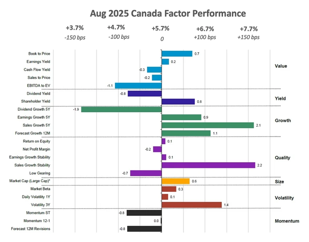 In August 2025, Canadian Equities posted strong gains, delivering a +5.7% return. This positive performance was primarily driven by Growth and Volatility subfactors, as well as large-cap companies.