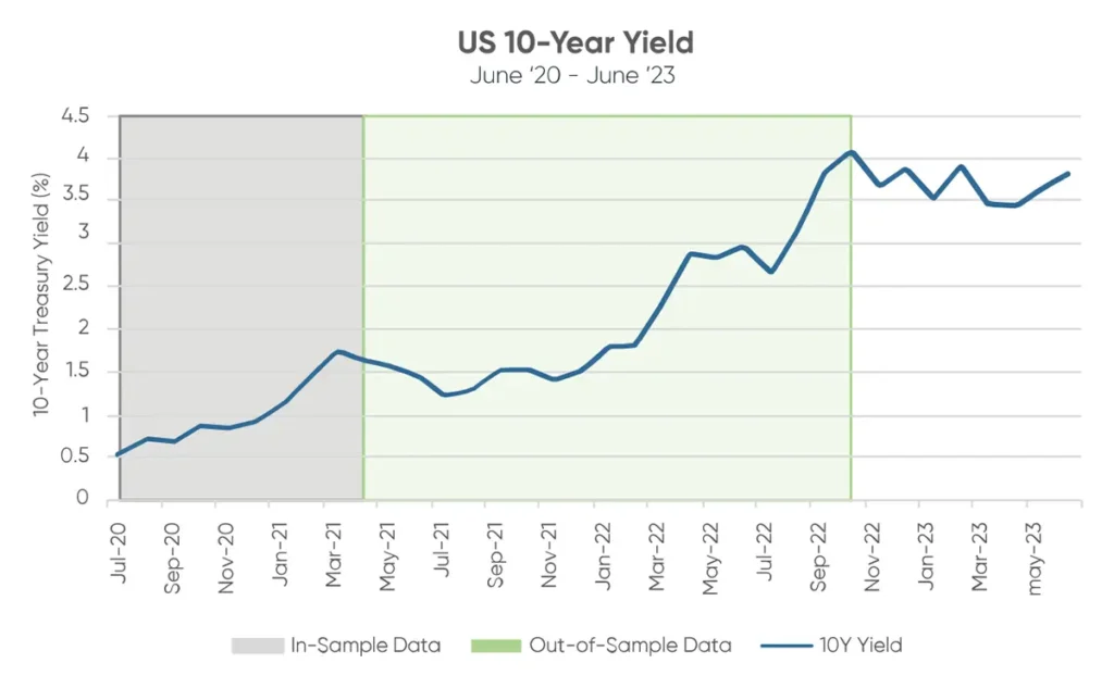 Between the trough and peak of the 10-year yield, spanning from June 2020 to October 2022, Value significantly outperformed Growth. However, this analysis only included data up to April 2021. To understand the situation in 2023, we divided the rate-rise period into in-sample (from June ’21 to April ’21), out-of-sample (April ’21-October ’22), and post-peak (October ’22 to June ’23) periods.