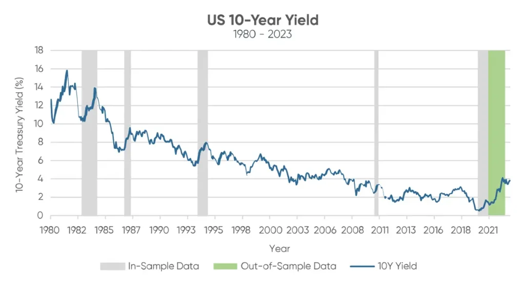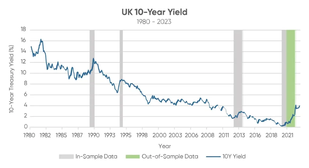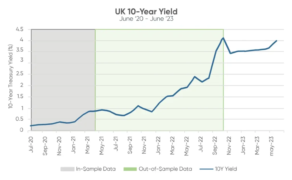As of September 2023, the US 10-year yield surpassed 4.3%, while the UK Gilt increased to 4.2%. Consequently, if the ongoing upward trajectory of the US and UK’s 10-year yields remains consistent, we can reasonably expect Value stocks to maintain their outperformance over Growth stocks in both countries. However, it’s crucial to note that once yields peak and fail to increase by at least 10% each month, the model’s predictive power diminishes, and the expectation of Value stocks outperforming Growth stocks no longer holds.