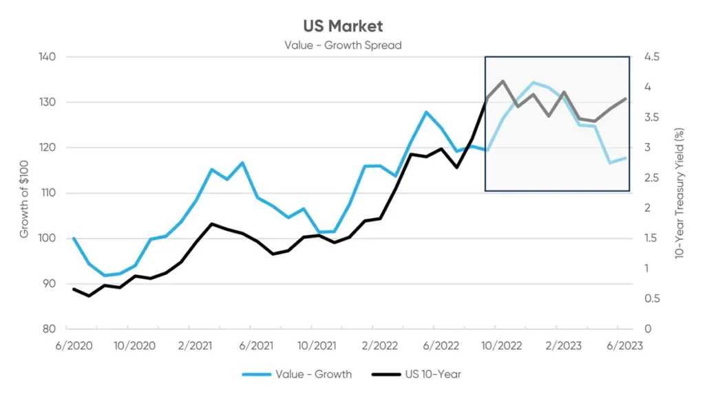 The trend is illustrated in the “US Market” chart below, where the Value-Growth spread consistently favored Value stocks throughout the total period but showed signs of weakening as the US 10-year yield fluctuated between 3.5% and 4% as of October 2022. In 2023, the decrease in the Value-Growth spread highlighted Growth stock outperformance in the US as several major technology companies recaptured valuations lost in 2022.