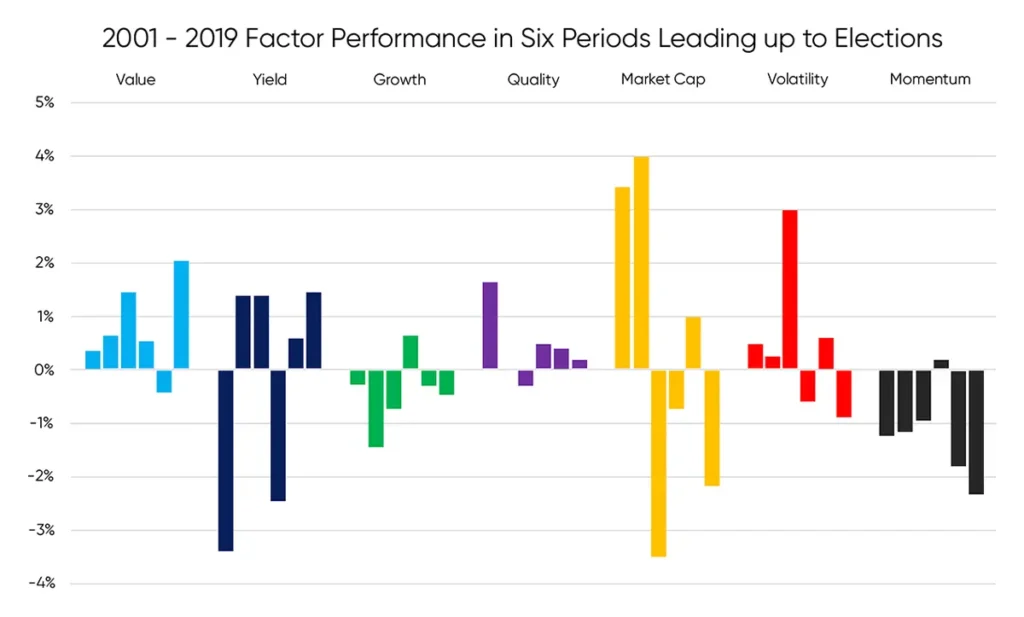 - Value stocks outperform the market in the period leading up to an election, while Momentum underperforms.