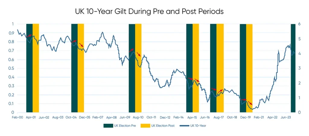 To contextualize these trends, we looked at the UK 10-Year Gilt. The red arrows in the above chart show that rates rose in the periods leading up to the first three elections in our analysis, indicating strength for Value. Meanwhile, in the three more recent periods, rates tended to be flat, or slightly down. The more consistent trend was in the periods following elections, where rates reversed. In five of the six periods, we saw rates decline substantially, which indicates Value weakness, Growth strength, and an environment where Momentum gained.