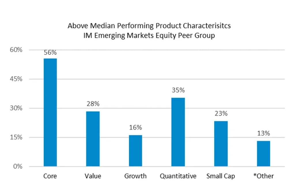 Figure 1 below is a percentage breakdown by characteristics of the 99 products with above median performance for the year. From a style perspective, core and value dominated growth, accounting for 84% of these products. Within growth, products either excluded China completely or were well underweight. Also of note is that quantitative products made up 35%, while small cap products accounted for 23%.