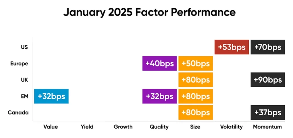 Equities in the U.S. region had a strong start to 2025, gaining 3.1% in January. Volatility and Momentum equities led the market, outperforming by 53 and 70 bps, respectively. Value equities closely followed, surpassing the market by 44 bps, with all value subfactors outperforming. Although not the top contributor to the region’s outperformance, compared to the previous month’s performance and the overall performance of 2024, Value subfactors outperformed the market this month, signalling a rise in investor confidence towards Value equities.