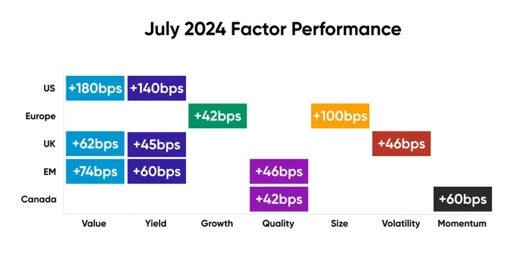 After reaching new highs early on, global stocks gave back some of their monthly gains in the second half of July. The US market favored Value and Yield, while Europe saw outperformance in Growth and Size. The UK market mirrored the US, demonstrating outperformance In Value and Yield. Emerging Markets were led by Value, Yield and Size. Canada exhibited a contrasting trend compared with its peers, with a notably larger factor premium for Quality and Momentum.