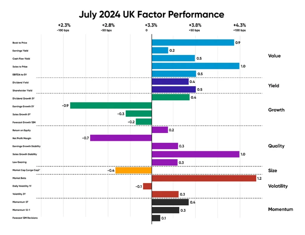 UK Smaller Companies had a strong month, as low valuations and expectations of interest rate cuts lifted sentiment. July showed a distinct preference for Value, Yield and Volatility stocks. Although most quality subfactors outperformed the market, stocks with high net profit margins underperformed in July.