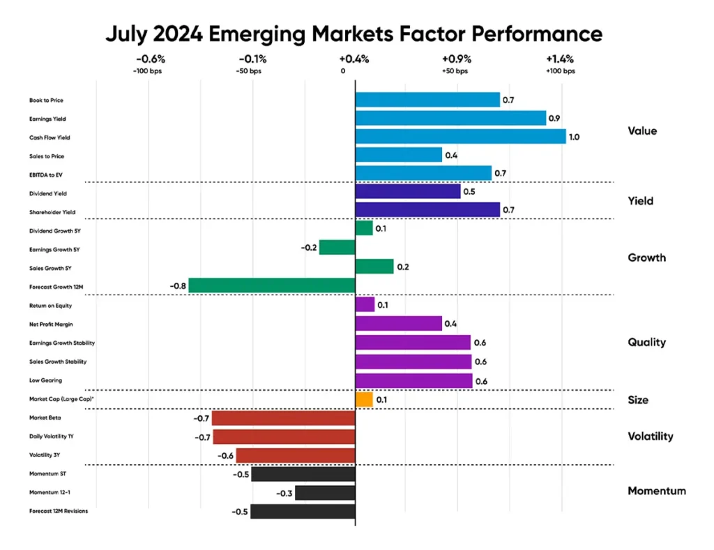 In July, the factor trend in Emerging Markets remained consistent with the trends observed in US and UK, with Value stocks generating active returns against the market, outperforming approximately 74 bps. Additionally, Quality observed a modest outperformance of 46 bps.