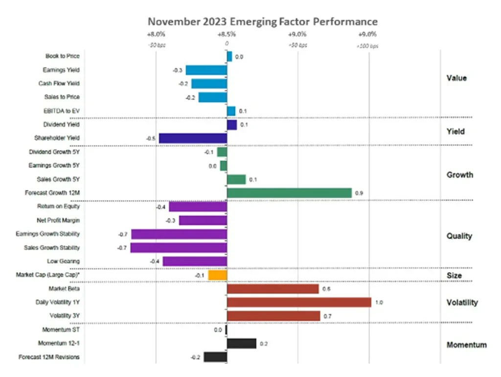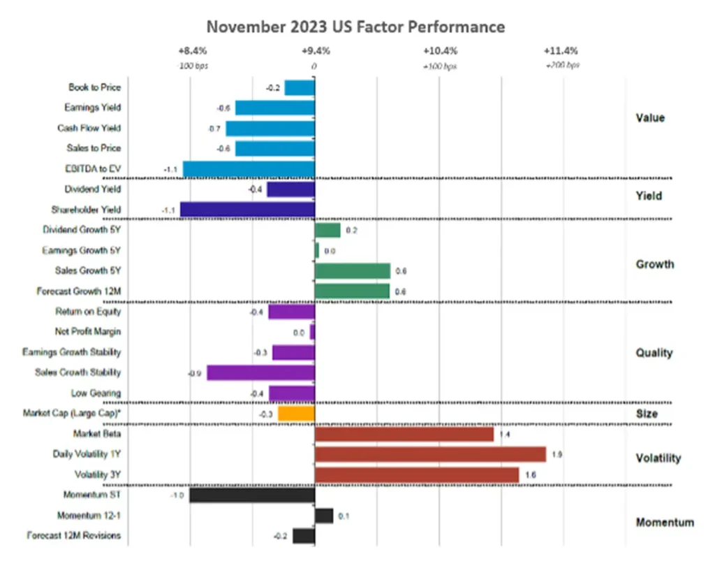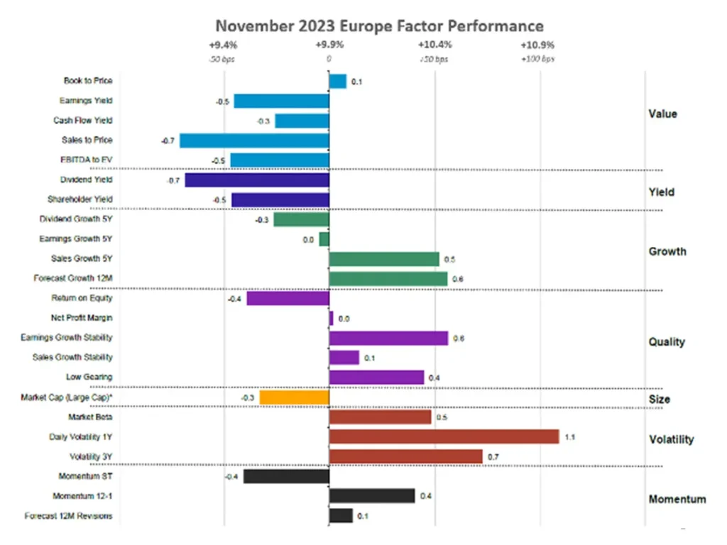 November marked a distinct shift in European factor performance with Volatility stocks taking the lead for the first time, displacing the previously favored Value and Yield equities that European investors preferred throughout 2023. Growth also experienced a surge in Europe, but unlike a defensive focus on dividend growth, the emphasis was on companies with strong sales growth over five years and favorable annual growth forecasts, mirroring the trend seen in the United States.