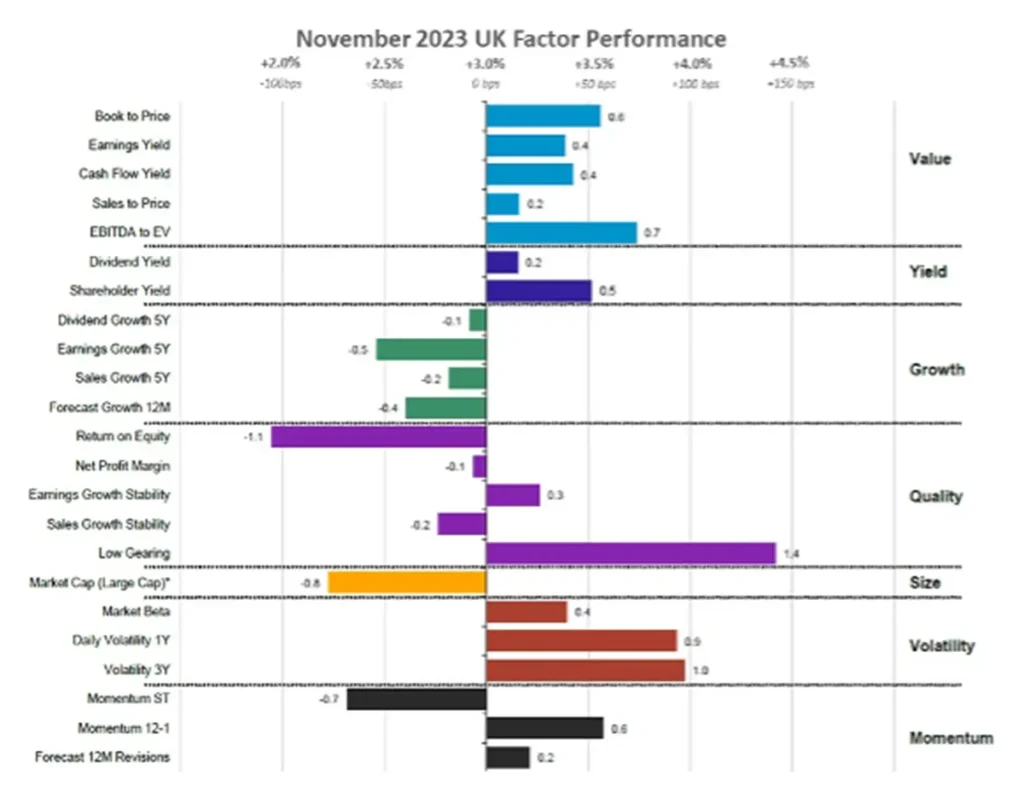 - UK: Volatility, Value, and low gearing (Quality) outperformed.