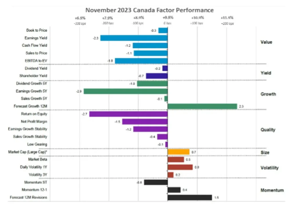The factor trend in Canada mirrors the disinflationary patterns across developed markets. Like in the United States, Canadian disinflation is far below that of the UK and even Europe, having decreased to 3.1% in October. Furthermore, mirroring its American and European counterparts, Canada also experienced a substantial return of nearly 10% in November.