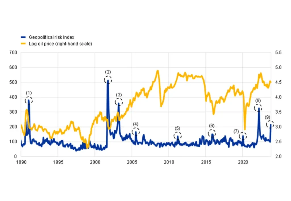 Oil prices may be impacted by geopolitical shocks due to decreased economic activity or increased risks to the supply of commodities. Tensions increase uncertainty about the economic outlook, which negatively affects consumption and investment and potentially disrupts international trade. Furthermore, the risk channel refers to how financial markets account for heightened future risks to oil supply, extending beyond the immediate geopolitical shock and incorporating potential long-term disruptions into current pricing.