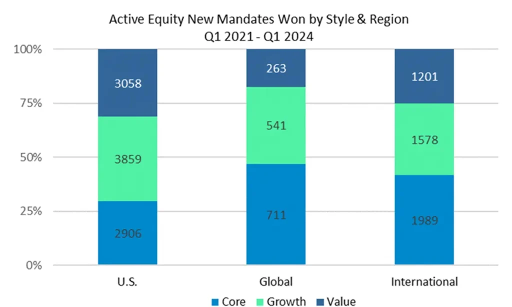 Highlights of key trends in institutional hiring activity, incorporating analysis from Confluence’s Prism & Style Analytics platforms. The focus is on the equity part of the analysis within the U.S. region as it was responsible for 67% of actively managed new mandates in the last three years (compared to 23% for non-U.S. and 10% for Global). Within active U.S. equity, we concentrated on the managers winning new mandates within Large & Small-Cap growth from Non-Profit clients, the factors that differentiated their products, and the post-negotiated fees paid.