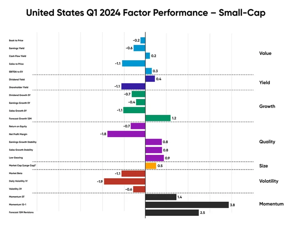 In Q1, US Small-Caps prioritized stability over volatility and growth, contrasting with Large-Cap trends. Value and Yield showed neutrality, with no notable over/underperformance. Although growth metrics lagged the market, stocks with promising forecasted annual earnings growth did outperform by 120 bps. However, stocks emphasizing stability-based Quality subfactors like earnings growth stability, sales growth stability, and low gearing delivered 80bps of outperformance, contrasted with the underperformance observed in volatile Small-Cap companies.