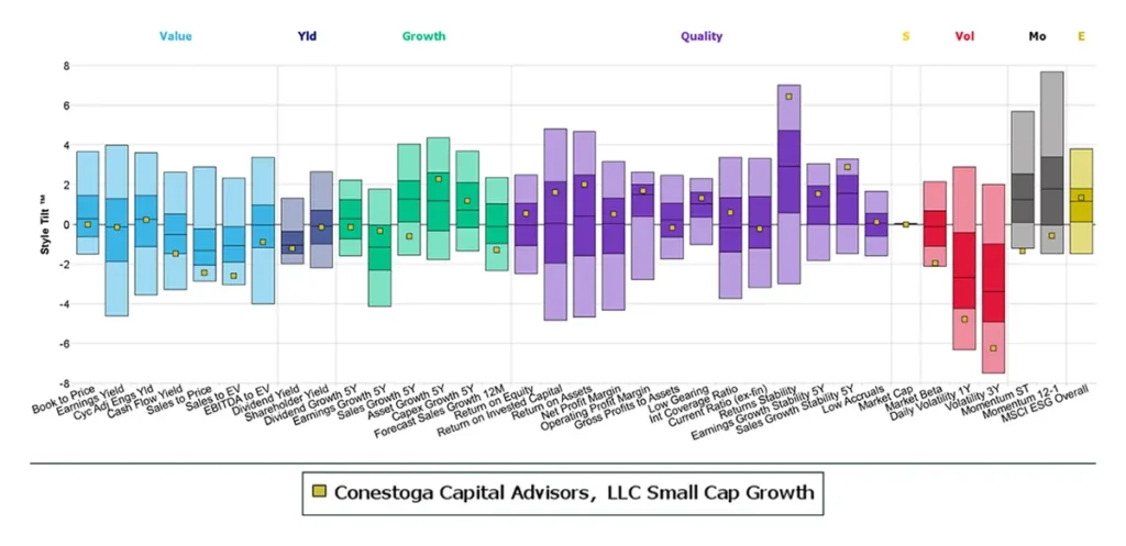 Conestoga Capital Advisors led this quarter with 48 mandates and $41 million in net inflows. Using Style Analytics Peer Insights, we assessed how Conestoga’s Small-Cap Growth fund’s factor exposures aligned with the aforementioned performance trends, distinguishing it from other managers in the category.