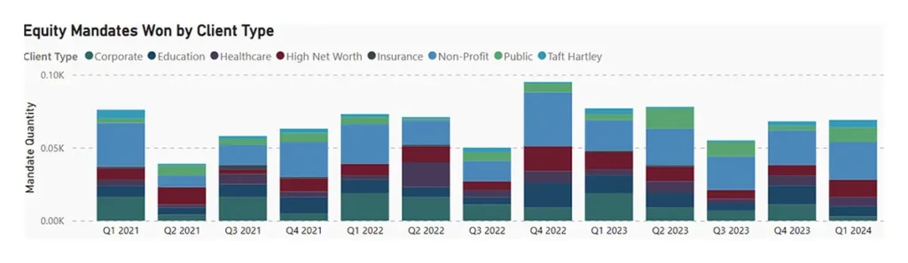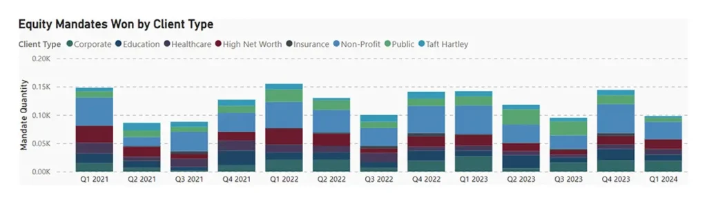 We used Prism Analytics to examine the number of equity mandates awarded for U.S. Large-Cap Growth by client type. Prism gives asset managers access to a range of previously unavailable market information: channel level flows of assets and allocations; actual post-negotiated fees by channel, investment type, and vehicle; and public and private (e.g., Corporate DB and Foundations & Endowments) mandates won/lost by manager. Over the last three years active managers won over 1,700 mandates in this space, with Non-Profit clients accounting for 28%.