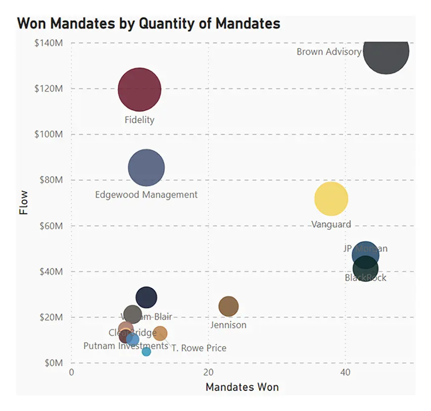 Brown Advisory, Fidelity, and Edgewood were the top three winning managers of active U.S. Large-Cap growth mandates within the Non-Profit channel in the last three years. Brown Advisory, which manages over #30 billion in concentrated Large-Cap growth portfolios, won forty-six new mandates with a net cash flow of $136m.