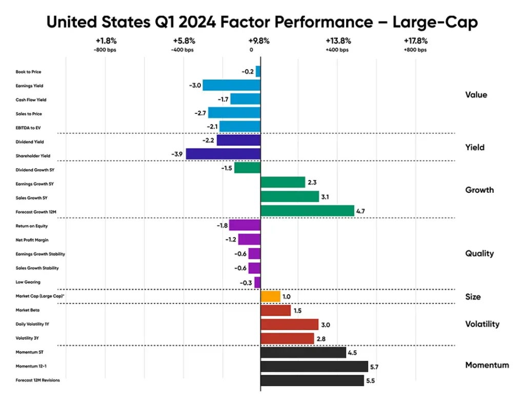 In the US, Growth significantly outperformed the market in the first quarter of 2024, supported by stocks with strong momentum. Stocks that excelled in Q4 continued their strong performance, driven by tech giants Nvidia and Meta, which delivered returns of 82% and 27%, respectively.