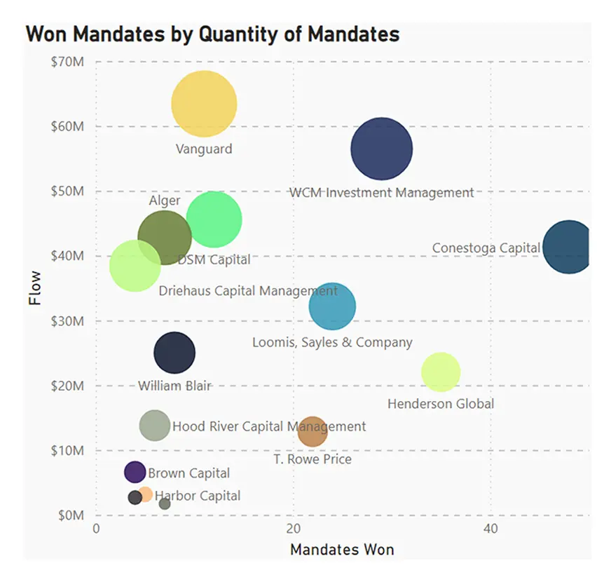 The top five winning managers of active U.S. Small-Cap growth mandates within the Non-Profit channel in the last three years were Vanguard, WCM, DSM, Alger, and Conestoga. While Vanguard had over $63m net cash flows, most of the assets were won in a single quarter. Conestoga Capital won more consistently (92% of the quarters) and won more mandates (48 vs 11) for $41m in net cash flows.
