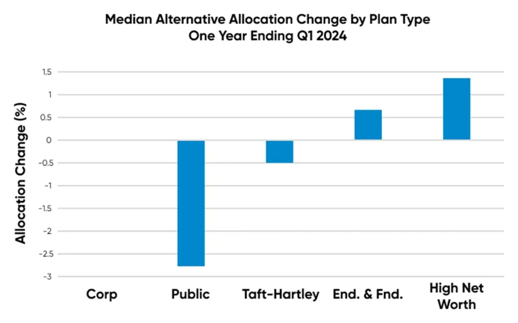 The plans that increased their allocations to Alternatives during the last year (High Net Worth and Endowments & Foundations) also have the highest allocations. Public plans had the largest pullback to alternatives during the year, down over 2.5% at the median level.