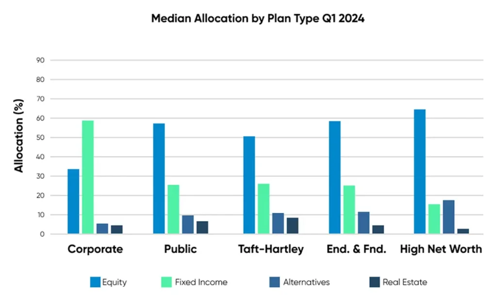 High Net Worth investors returned 5.49% at a median level in Q1 of 2024, outperforming all plan types. Comparatively, Corporate DB plans returned 1.46% for the quarter. While long bond performance in December buoyed corporate plan performance last quarter, that same exposure underperformed in Q1; therefore, corporate plans lagged other plan types. The plans with the highest exposure to equity (Public, Endowments & Foundations, High Net Worth) posted the most robust performance for the quarter and were the three plan types to outperform a traditional 60/40 benchmark return of 4.63%. (60% MSCI ACWI Index/ 40% Bloomberg Barclays U.S. Aggregate Index).
