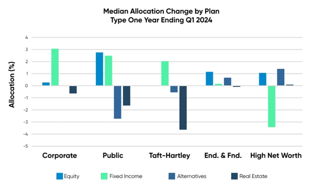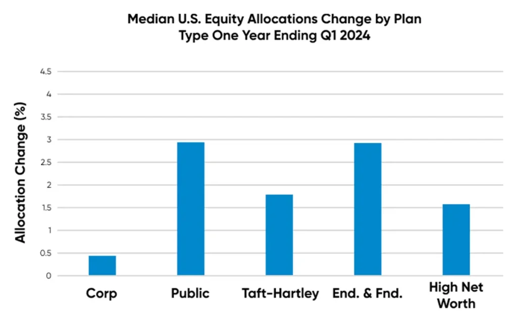 The public U.S. equity market posted very strong returns in Q1 2024; for defined benefit plans, the median U.S. equity return was 9.87%. Corporate plans continue to be underweight U.S. equity with a median allocation of 20%, roughly half the allocation compared to other plan types. All plan types increased their allocation to U.S. equity for the year ending March. High Net Worth plans, the best-performing plan type for the year, increased their allocation to U.S. equity to 40%.