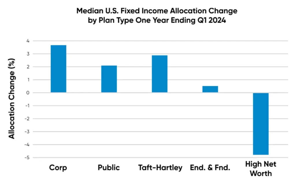 All plan types other than High Net Worth increased their allocation to U.S. Fixed income over the last year. Corporate plans, which have the highest allocation to the asset class at 57%, also increased their allocation more than any other plan type during the last year.