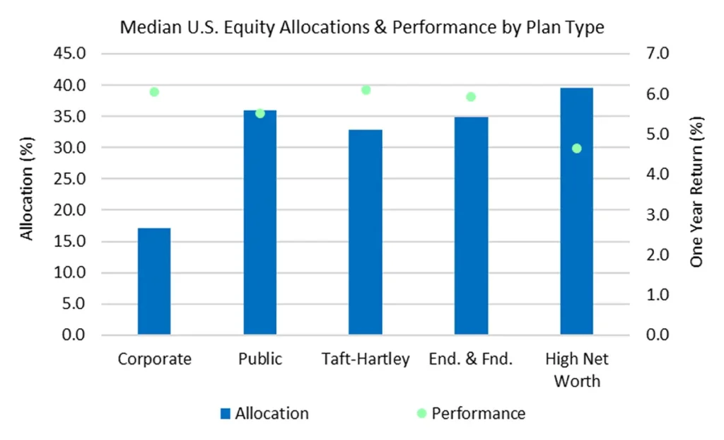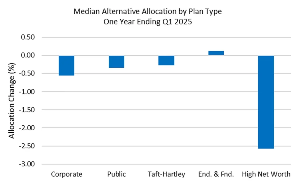 Due to their lower exposure to private equity, corporate plans allocate half the amount to alternatives compared to other plan types. Allocations at a median level were down across all plan types, other than Endowments & Foundations, which saw a slight increase to their alternative allocations over the last year.