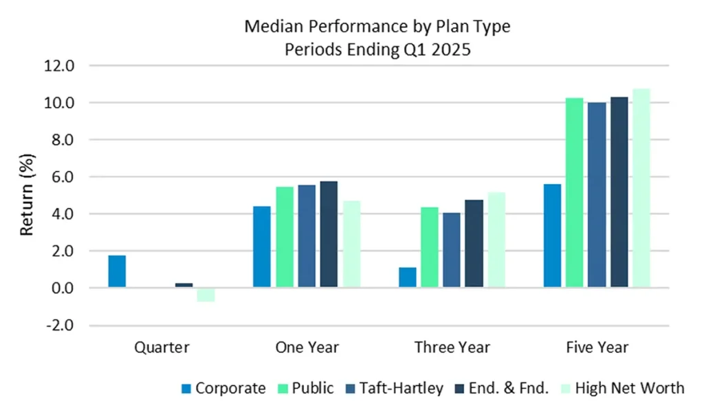 - High Net Worth plans, driven by their comparatively high equity and low fixed income allocations, were the worst performers by plan type for the quarter, returning -.73% at a median level.