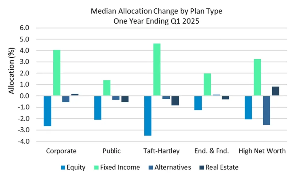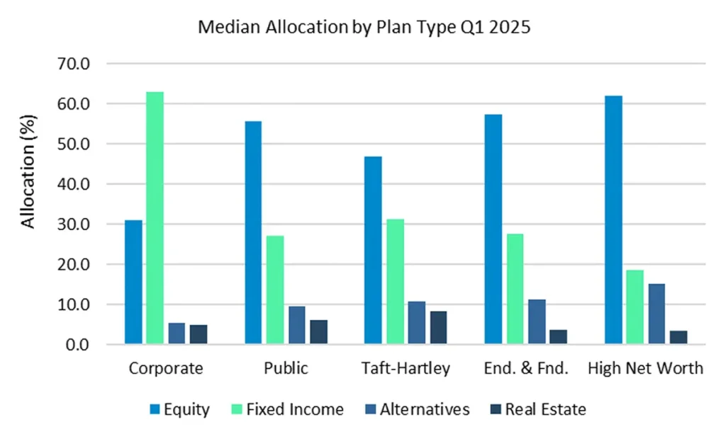 Corporate plans, which outperformed all other plan types for the quarter, continue to hold the largest fixed-income allocation. Since Q1 2024, all plan types allocation to fixed income have increased by an average of 3%. Conversely, allocations to equity have decreased by an average 2.3% in the last year.