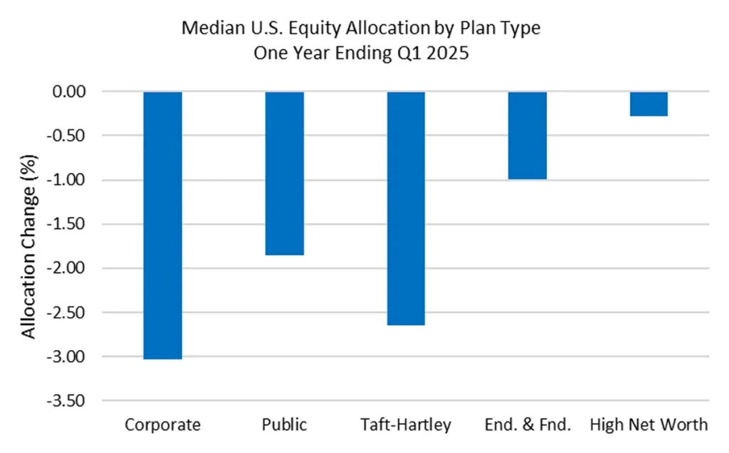 U.S. public equity markets posted negative returns in Q1 2025. The Russell 1000 Index returned -4.49%, compared to defined benefit plans, which had a median U.S. equity return of -4.68%. Corporate plans continue to be underweight U.S. equity, with a median allocation of 17.13%, roughly half of the allocation compared to other plan types. All plan types decreased their allocation to U.S. equity in Q1.