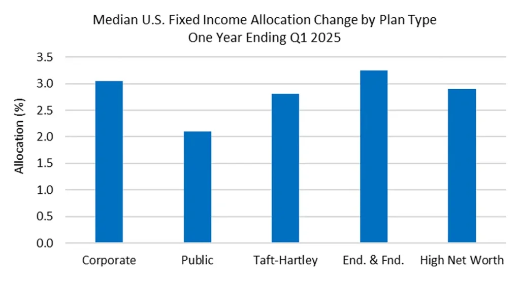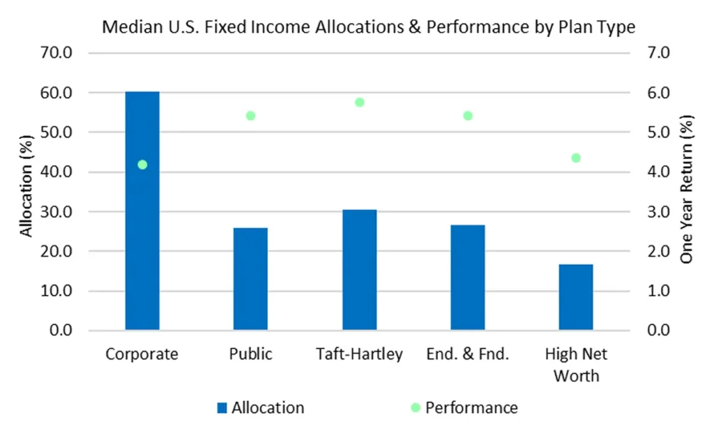 All plan types increased their allocation to U.S. Fixed income over the last year, led by Endowments & Foundations by 3.25%. Corporate plans, which have the highest allocation to the asset class at 60.25%, also increased their allocation by more than 3% over the last year.