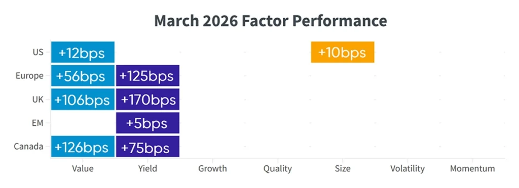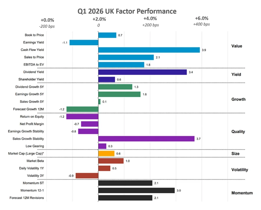 From a factor perspective, March marked a clear shift in investor sentiment, with a rotation toward cheaper, higher-yielding, and higher-quality stocks. Despite the March downturn, the UK outperformed other developed regions such as the U.S. and Europe on a quarterly basis, delivering a positive return of approximately 2% for Q1 2026. Over the quarter, factor trends were broadly aligned with Europe, with Value, Yield, and Momentum emerging as the key areas of investor preference.