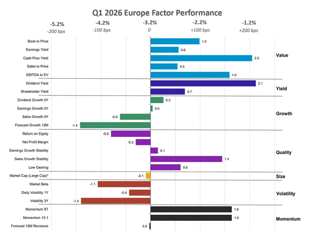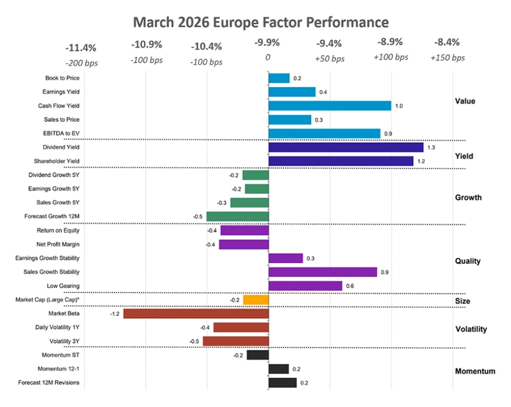 The sharp decline in March was driven by rising inflation, uncertainty around monetary policy, and concerns over slowing economic growth, which weakened investor sentiment. Europe’s higher exposure to cyclical sectors further amplified losses, particularly in Growth stocks, while investors rotated toward more defensive factors such as Quality and Yield amid increased market volatility.