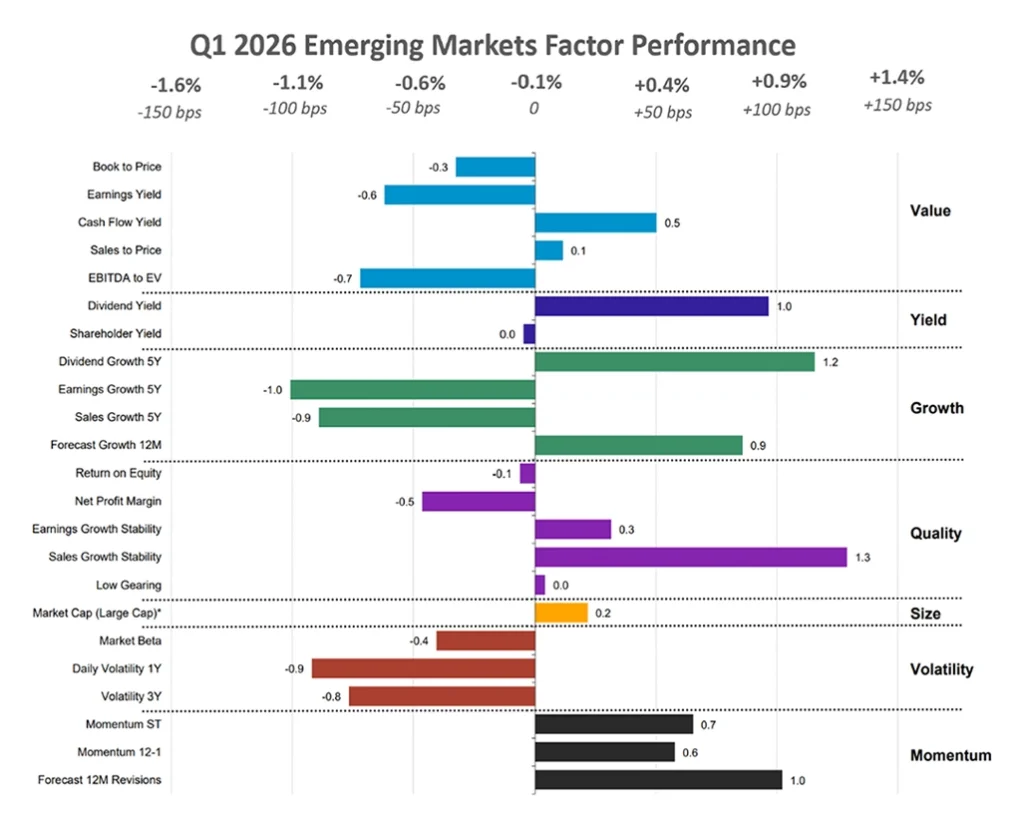 Emerging markets experienced a strong start to the year, with solid performance in January and February, before a sharp reversal in March, when the region declined by approximately 13.4%. January was driven by strong contributions from high Volatility and Momentum stocks, supporting broad-based outperformance.