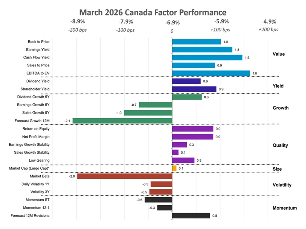 Canada’s underperformance in March was driven by a global risk-off environment, which weighed more heavily on its cyclical sectors such as energy, materials, and financials. This was further amplified by commodity price weakness and a rotation away from higher-beta exposures like Momentum and Volatility.