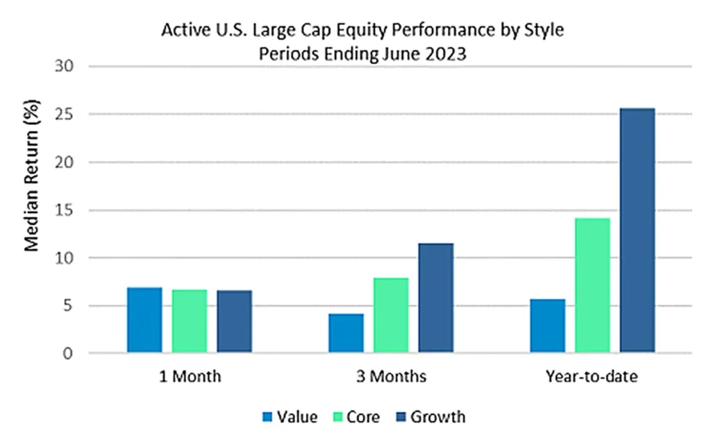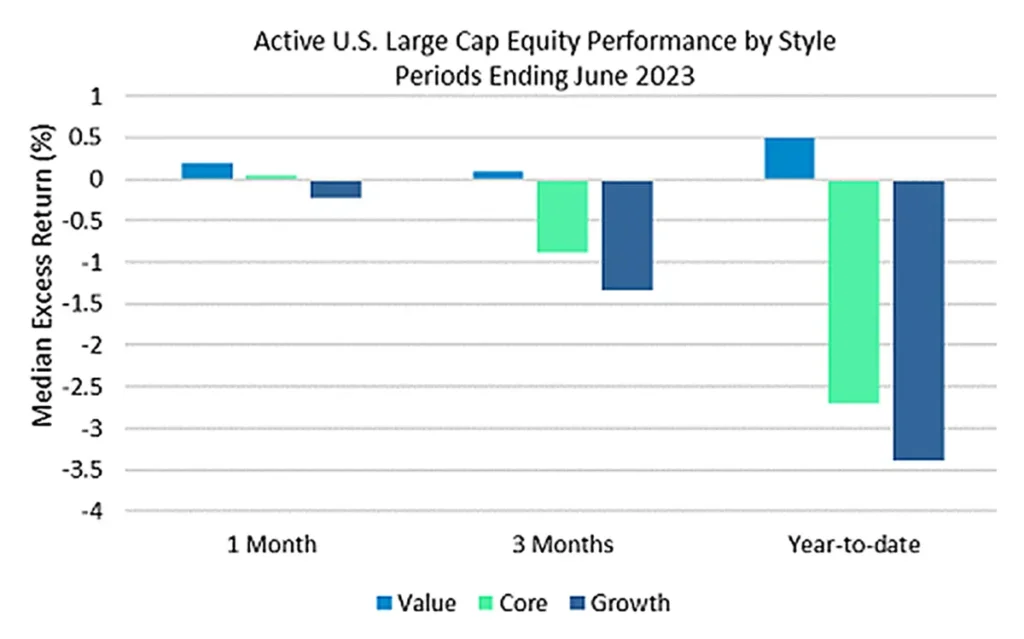 - Year to date, the median active U.S. large cap value manager outperformed their benchmark by 50 basis points compared to the median U.S. large cap growth manager which underperformed by more than 3%.