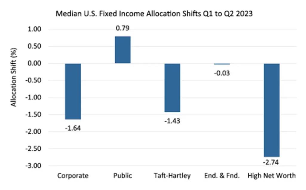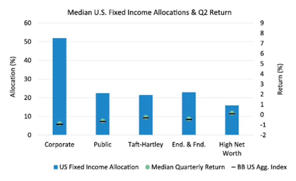 The returns from U.S. fixed income in the second quarter of 2023 were miniscule. We did not see much difference in performance between the plans U.S. fixed income returns, at a median level, and the Bloomberg Barclays U.S. Aggregate Index. Corporate plans have an allocation to this asset class that is more than double what other plans are allocating. This has clearly been a detractor of overall corporate plan performance in the short-term.