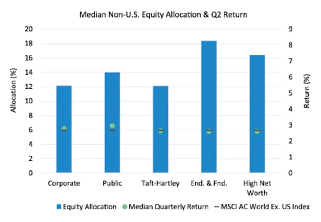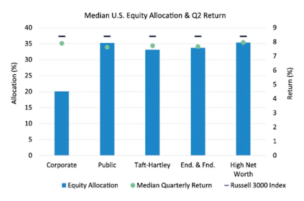 The U.S. public equity market has been the best-performing area within the public equity asset class and across all asset classes in the most recent quarter and year-to-date. All plan types have clearly benefited from this allocation based on the asset class returns reported. However, when you compare the returns attained by plans in the second quarter to the Russell 3000 index, the relative performance is discouraging. Every plan type underperformed the index in a particularly good-performing quarter for U.S. public equities. With regards to tactical asset allocation shifts, we saw High Net Worth portfolios decrease their allocation to U.S. public equities by 2% over the quarter, at a median level.