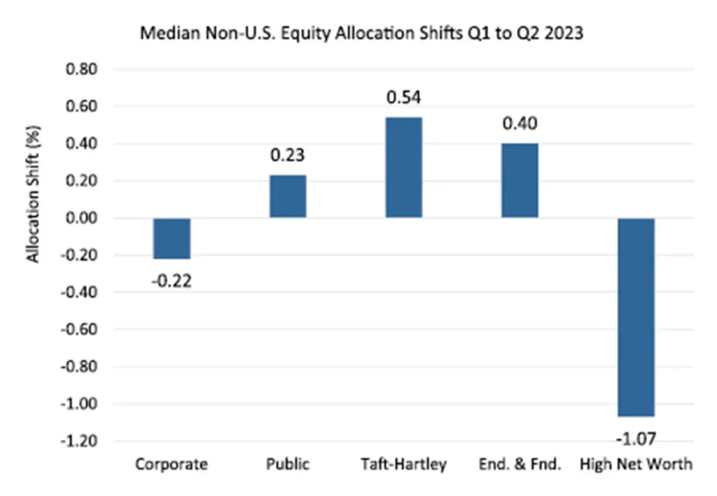 After an electrifying Q1 2023 for Non-U.S. public equities, the returns in Q2 were moderate. Endowments and foundations have the highest exposure to Non-U.S. equities. Similar to what we saw in public U.S. equities, the High Net Worth plans decreased their allocation to Non-U.S. equities by 1% over the quarter.
