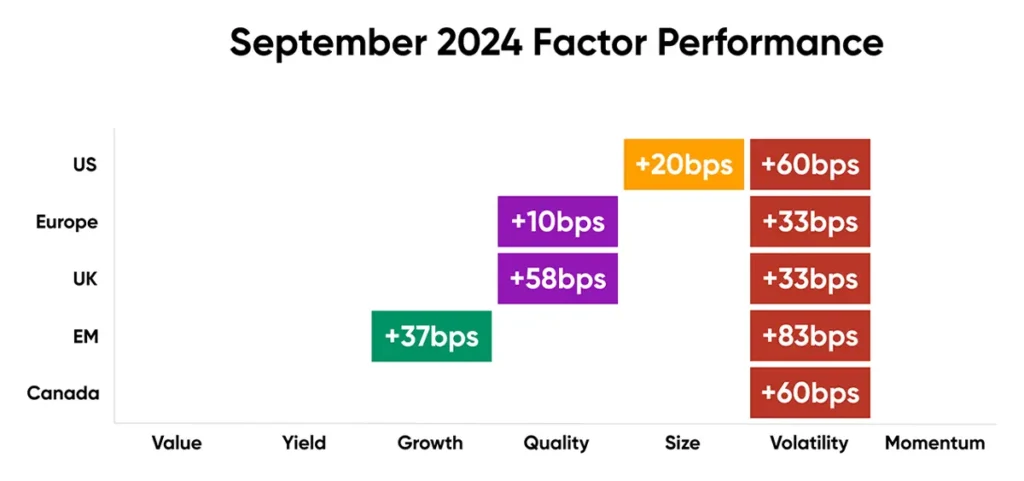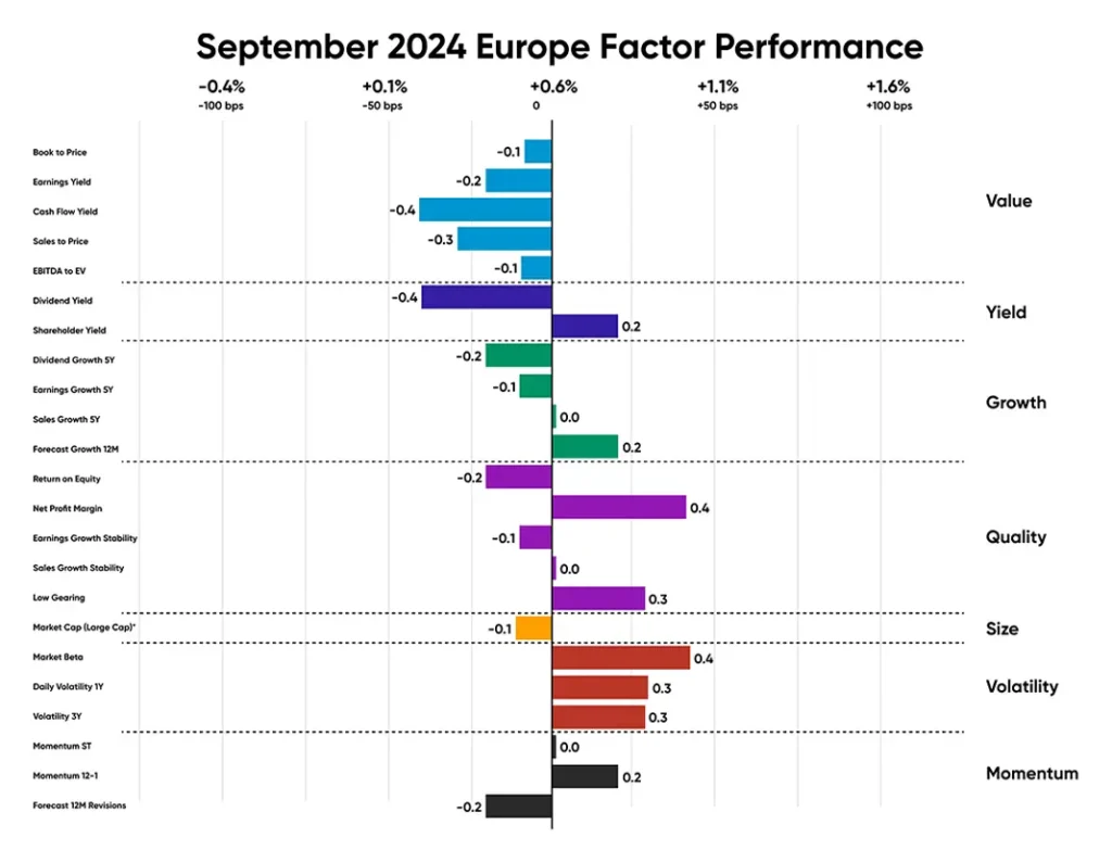 At the start of September, the US market tumbled as technology stocks faltered and economic data reignited concerns about the economy’s health. However, it quickly rebounded as investor confidence grew around a soft landing for the economy and expectations of lower interest rates, ending the month with a 2% return, and the quarter overall finished with a 5.5% gain. While Volatility subfactors had the most significant influence on the region’s monthly performance, outperforming the market by 60bps, the strong quarterly performance was mainly driven by the outperformance of Value and Yield, which exceeded the market by 84bps and 140bps, respectively. Quality delivered mixed performance this quarter, highlighted by a strong outperformance of 150bps in return on equity compared to the market.