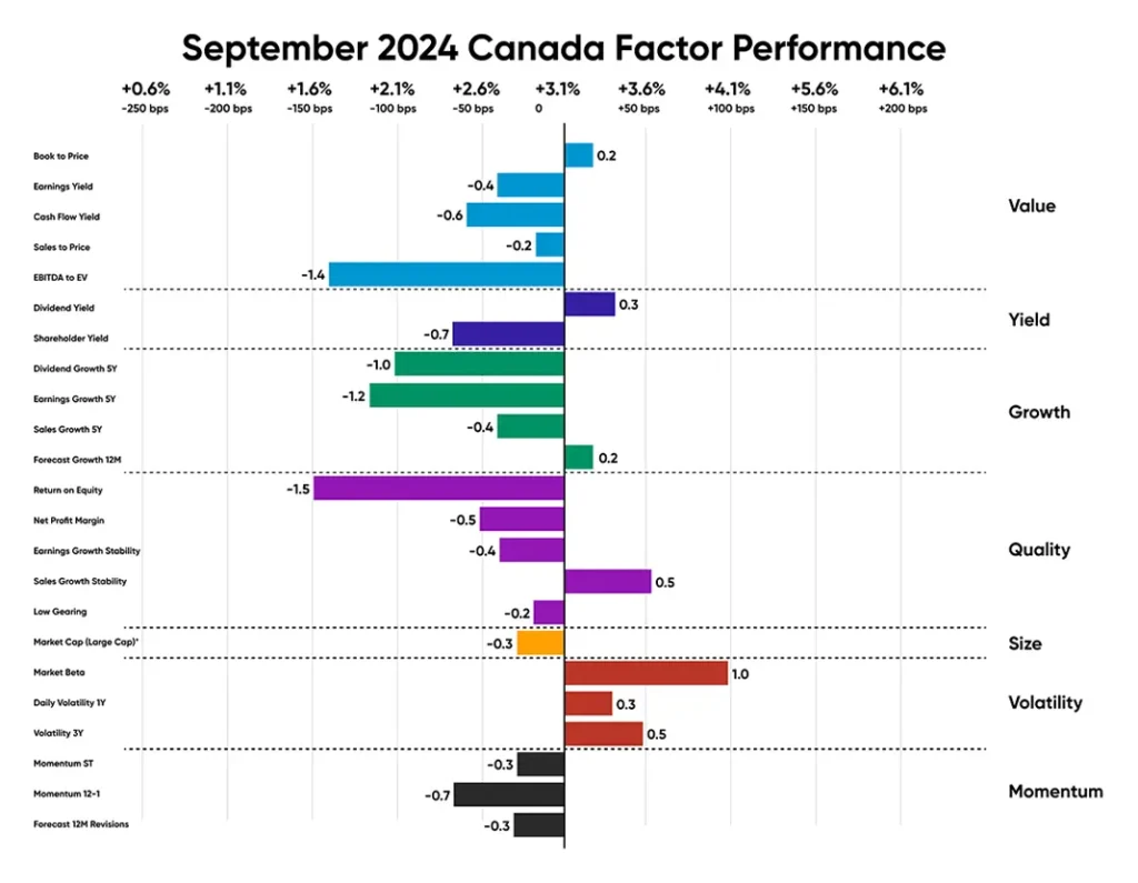 The Volatility stocks with a high market beta that led Canadian markets in September mainly include the Infotech company Shopify Inc. (+8.0% in September) and financials company Brookfield Corp. (+6.0% in September). Key companies driving the forecast 12M revisions in the quarter were the financials company Royal Bank of Canada (+18.5% in Q3) and financials company Toronto-Dominion Bank (+17.0% in Q3).