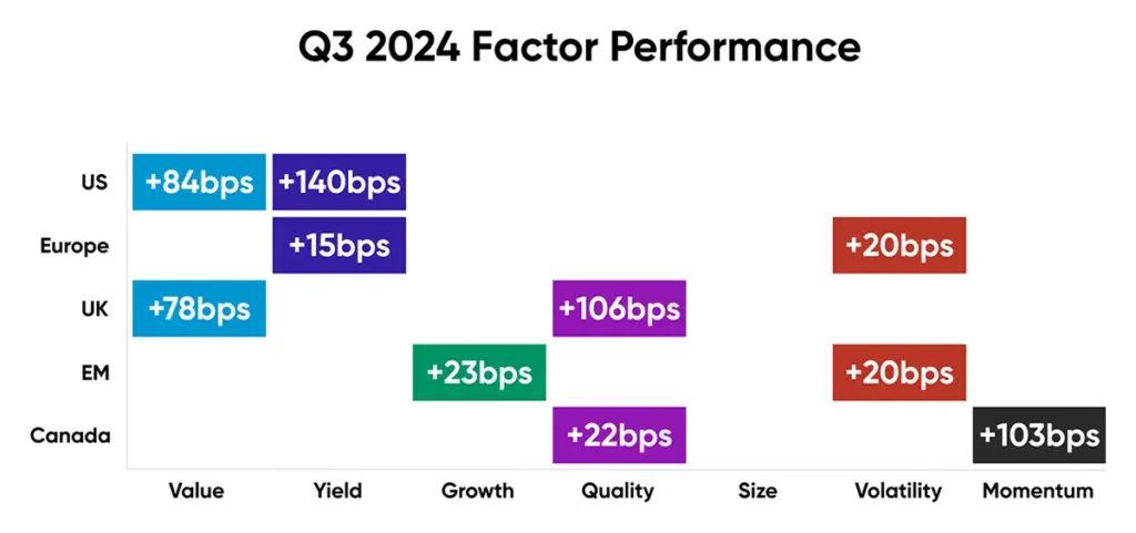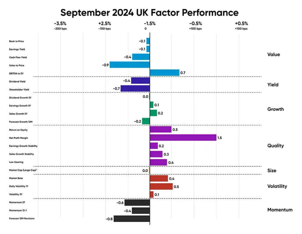 Although UK equities outperformed their US and European counterparts in the second quarter of 2024, they underperformed in comparison during the third quarter with a quarterly performance of 2.2%. UK saw an outperformance of 78bps in Value and 106bps in Quality in Q3 2024, while Yield and Growth were the laggards. The underperformance delivered by the UK in the month of September was predominantly driven by factors such as Momentum, Yield, and Value, which lagged behind the market despite Quality and Volatility outperforming by 58bps and 33bps, respectively.
